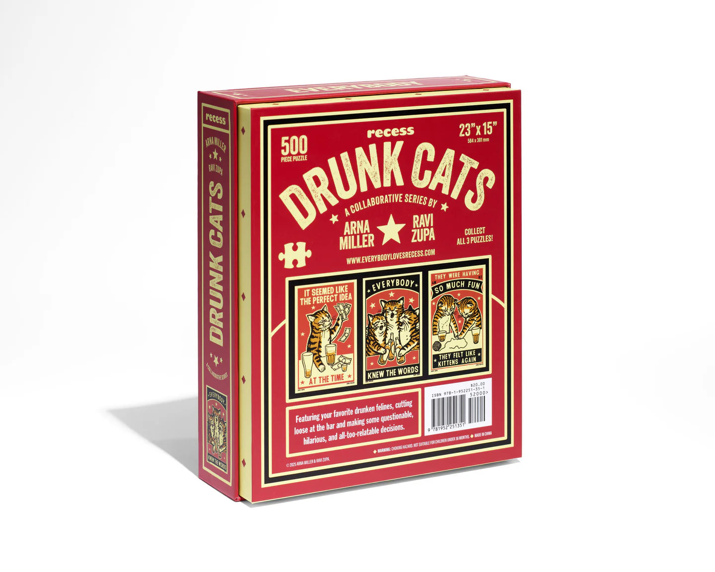 Join our feline friends for another night out on the town as they make merry and get into some all too relatable shenanigans! This quirky cat-themed illustration is a fun family activity for adults and kids alike. Puzzle pieces come packaged in a sturdy and easy-to-wrap box, perfect for gifting, reuse, and storage.